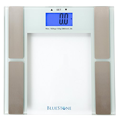 -. Feature : Deluxe Glass Digital Body Fat Scale - Displays Body Weight, Body Fat, Body Water, Body Muscle, Calories and Bone Mass! / This Digital Body Fat Bathroom Scale uses a high precision strain gauge sensor to accurately measure your body weight, body fat percentage, body water percentage, body muscle percentage, bone mass substance, BMI and Calorie Count / It automatically turns on and off when you step on the scale. A large easy to read LCD display also features a blue backlight, allowing for easy viewing / Max Capacity: 396 pounds - Power: 2x3V CR2032 Lithium Battery (Included) / Scale Dimensions: 11.5 inches (L) x 12 inches (W) x 0.75 inches (H) - LCD Display Dimensions: 3"L x 1.5"W