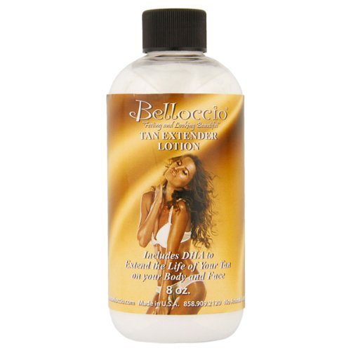 8 Ounce Bottle of Belloccio Tan Extender Lotion. Daily body and face skin moisturizer, tan enhancer and extender. Skin revitalizing formula with a perfect blend of vitamins, oils and antioxidants to help combat daily skin damage. Keeps the skin hydrated and ideally moisturized while smoothing and firming the the skin. Includes DHA to help enhance and extend the life of your tan by keeping your tan even, smooth and slowing it's fading proccess. Safe for daily use on all skin types, as it's gentle on the face and body. Has a fresh clean fragrance. Paraben free. Recommened for use after showering or before bed Directions: For best results, apply an even layer to freshly cleansed skin. Use sparingly near elbows, knees, ankles and knuckles. Wash palms of hands immediately with soap and water after each application as lotion contains tanning DHA. Continue use between tanning sessions to help maintain color.Feature