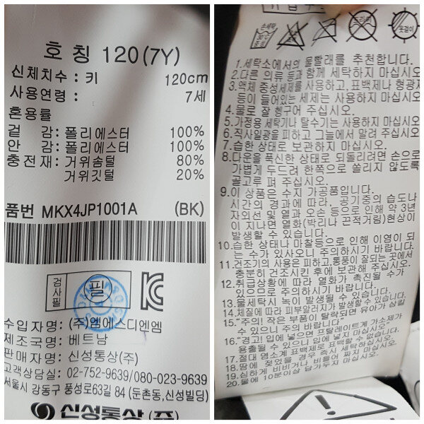 구스 다운 제품 입니다. 솜털 80% 깃털 20%로 구성되어 있습니다. 후드는 분리 되지 않습니다.
