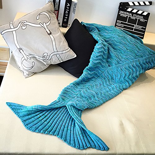 Adults Mermaid Tail Blanket Knitted Sofa Blanket Super Soft Wave Handmade Crochet Mermaid Sleeping Blankets All Seasons 75inch(Blue)