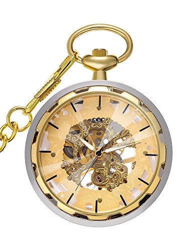 -. Feature : Clear appearance: the pocket watch in silver and black without Roman numerals on dial face, clear appearance with gold movement, easy to read time and allow a whole view of the gear / Gold chain: the pocket watch with a gold chain, the size of the chain is approx. 37.5 cm/ 14.8 inches in length, suitable for hanging and putting it in your pocket / Setting time: mechanical hand-wound movement without any battery; Twisting the top button on the spin, tightening a walk for 24 hours (not too tight, avoid damaging the movement) / Application: comes with a gift box and microfiber cloth for daily easy cleaning, you can apply them for suit, vest, pants or other clothes / Good gift: the pocket watch with good workmanship, precise mechanical movement, classic case with long chain, good touch feeling, good gift for yourselves, friends, relations or other people
