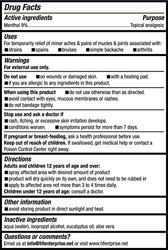 -. Feature : Rapidly-drying, easy-to-use spray. / Temporary relief from pain associated with arthritis, backache, muscle and joint soreness, strains, sprains, bruises, rashes and minor burns. / Light, yet effective formula works on contact bringing with it the cooling relief of menthol. / Contains soothing aloe vera and eucalyptus oil to protect skin as it helps to relieve pain. / No need to rub in. Just spray & go!