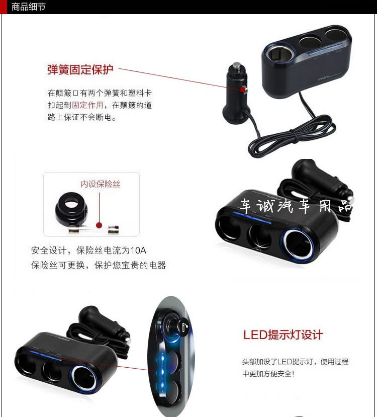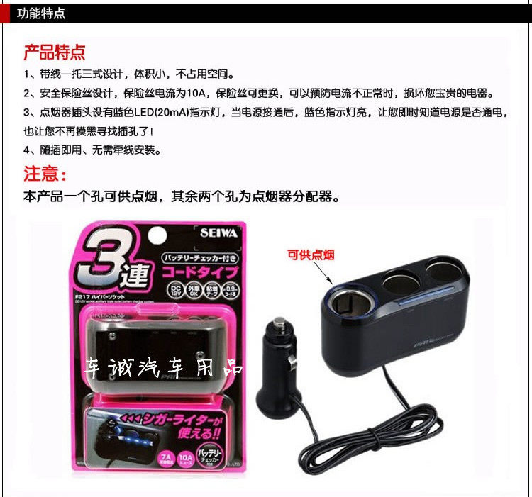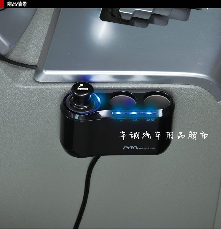 Many electrical appliances are increasing the vehicle power, but only a carcigarette lighter socket how do enough? The cigarette lighter adaptersocket can let a cigarette lighter socket into three, 3 electric car for use at the same time. This little thing principle is simple, but it is sweet and practical. Exported to Japan car Jiapin, use of advanced plastic materialsproduction. The unique blue LED lighting design, to display the working state. The power, can let you night is no longer dark looking for Jack,everything for the driver intimate design for convenient use. By the three major Japanese brand car supplies one of the Seiwa (see and) Company produced, shape and exquisite workmanship is exquisite, compact,exemplary industry quality, absolutely is your car the most intimate and practical equipment.