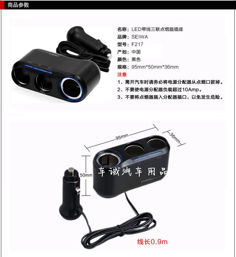 [name]: SEIWA fashion LED lamp belt line vehicle triple power socket powerdistributor with a cigarette lighter outlet