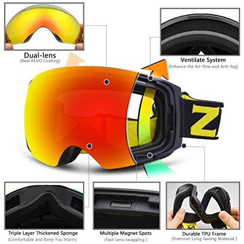 Lens Material: PC Frame Material: TPU Lens Style: Spherical double layers Lens Finish: Real Full REVO Coating Magnet Lens-changing: 8 magnet spots UV400 Protection Coating: Yes Anti-fog Coating: Yes