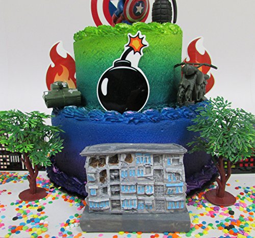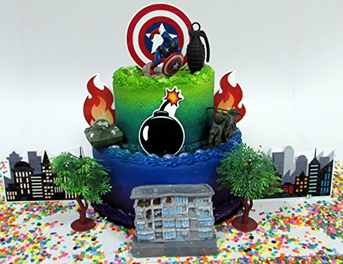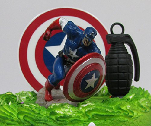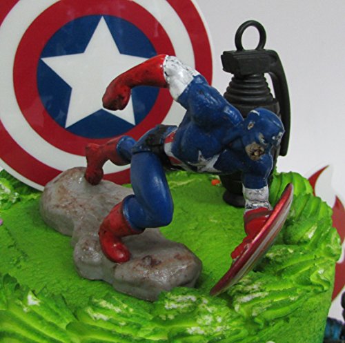 Avengers Captain America Themed Birthday Cake Topper Set Featuring Captain America and Decorative Themed Accessories