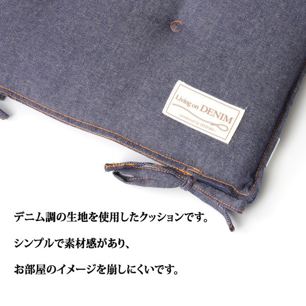 デニム調の生地を使用したクッションです。お部屋の雰囲気を崩さずにご使用いただけます。汚れが気になった際は手洗いでお手入れもできるためいつでも清潔にご使用いただけます。