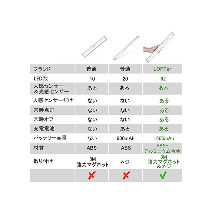 원본상품명: LOFTER LEDセンサライト USB充電可能 62 人感センサライト 屋 光感センサ 自動点 クロゼット 足元 中電 非常 省エネ 白色