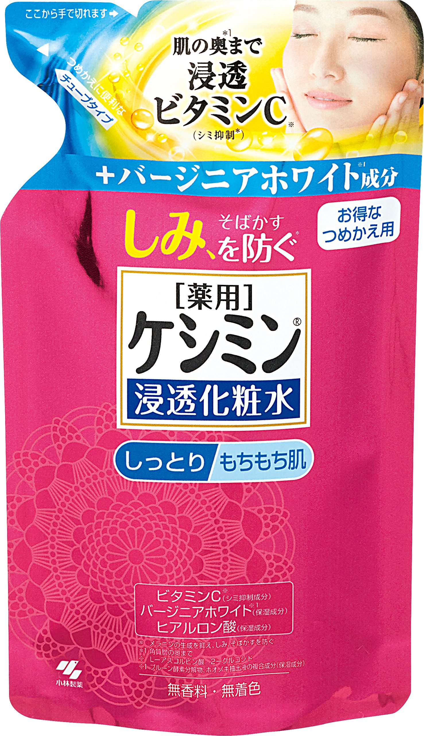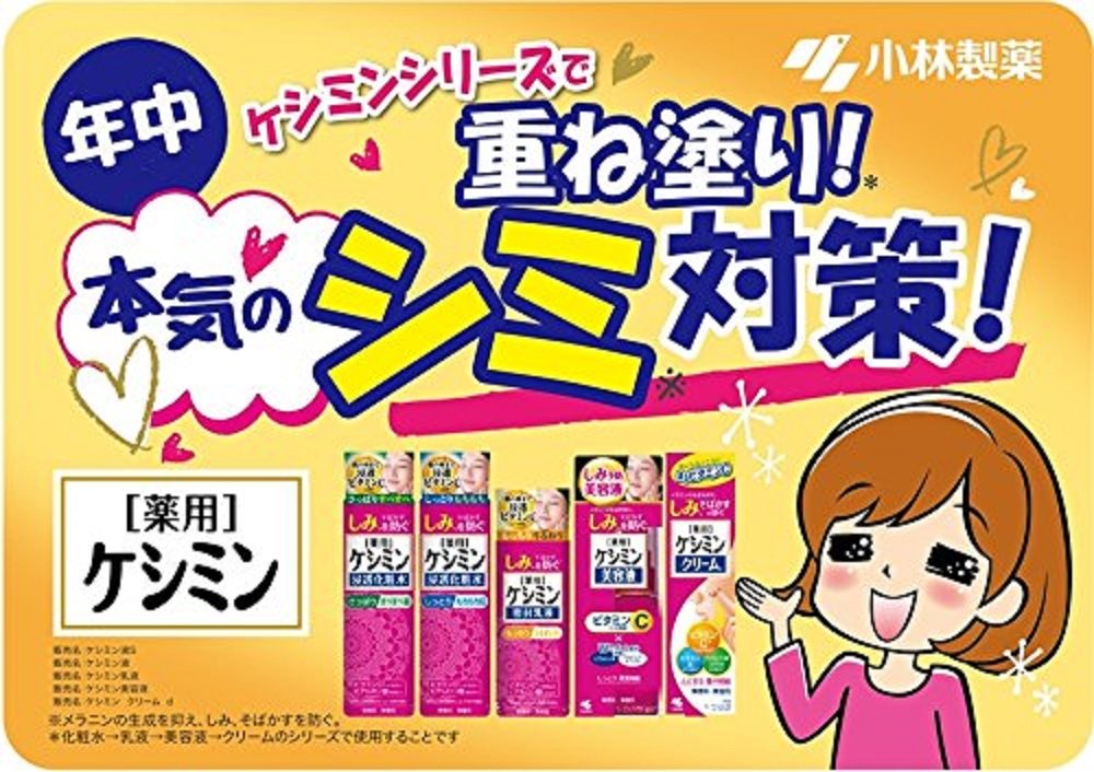 For anti-spot measures of the entire face, a medicated lotion "Keshimin Liquid" which penetrates deep into the stratum corneum and suppresses the generation of melanin, which contains vitamin C derivative (spot control component) and causes spots.