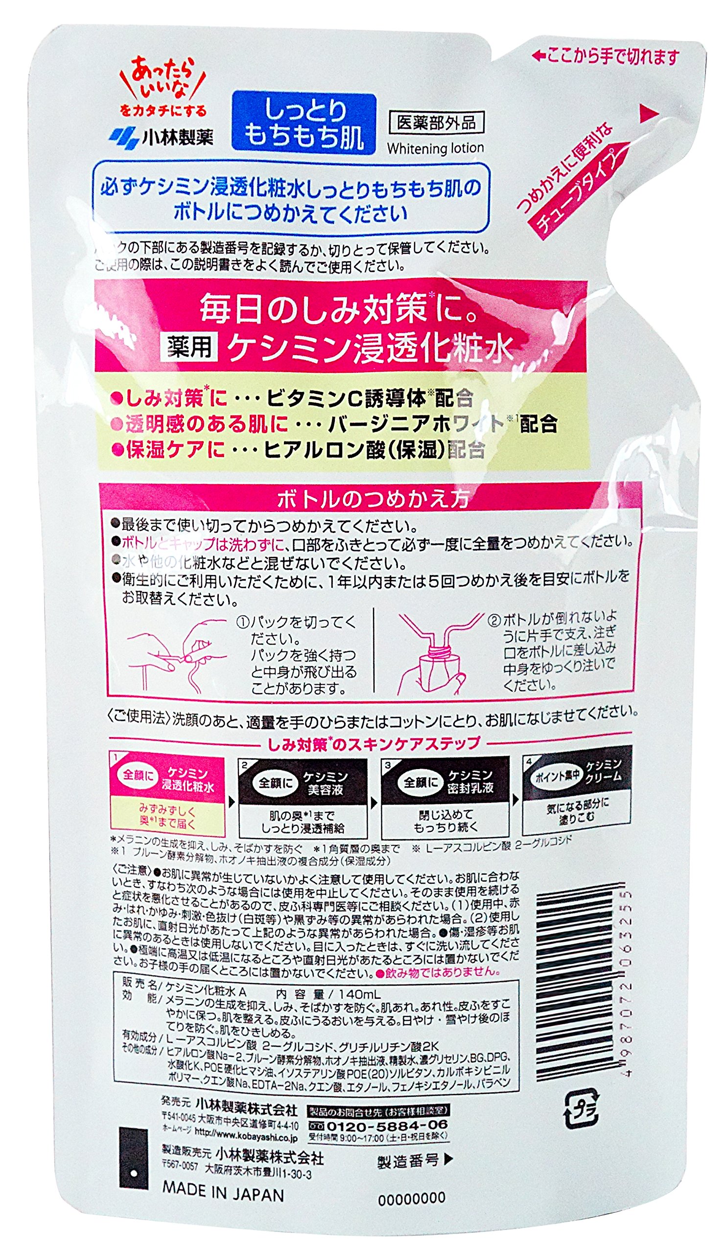 "Medicated Keshin liquid M for moisturizing type refill type 140 ml" is a medicated skin whitening lotion that can suppress the formation of melanin and care for the spot imitation invisibility of the whole face.