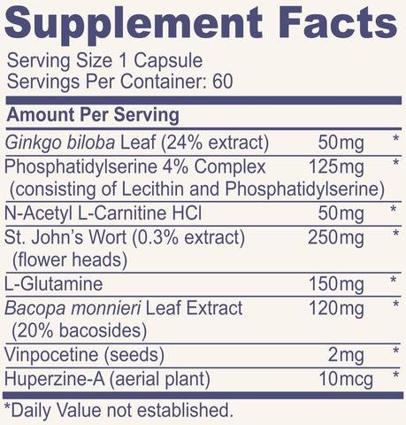 Brain Formula, Premium Mind Supplement-Brain Function booster for Men & Women with L-Carnitine , Ginko Biloba, St Johns Wort, Bacopa Monnieri & More. Nootropic to Support cognitive function, Memory, Mental Clarity and Focus. 60 capsules/2 month supplyFeature