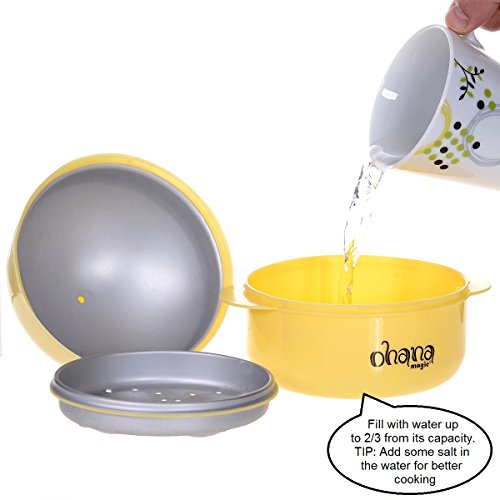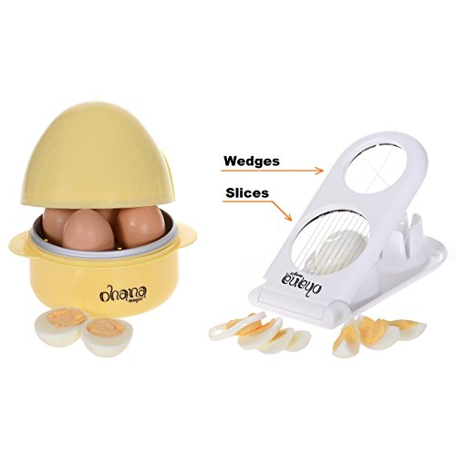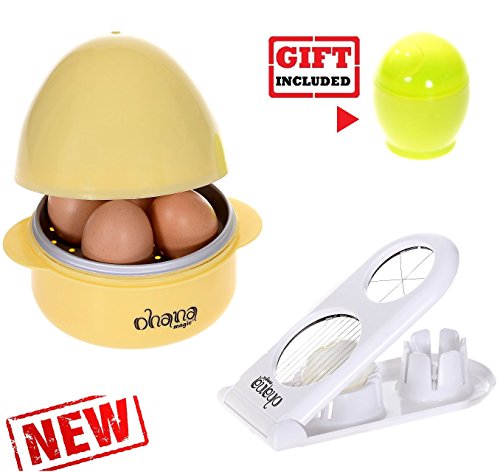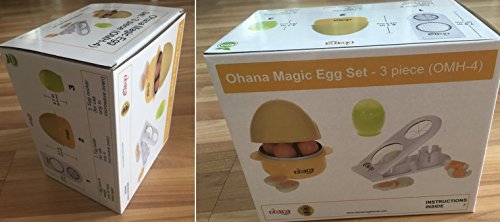 EGG BOILER ONLY for microwave. DO NOT use in conventional oven! Open the lid, remove the aluminum plate and add water at 2/3 from the base capacity (for best results, put also some salt). Place 1 to 4 eggs in the indentations on the aluminum plate. Fasten the lid and place it in the microwave. Cooking time for 4 eggs (fewer eggs will require less time) in 600 watts micro: - Soft boiled 7-8 minutes - Medium 9-10 minutes - Hard boiled, 11-12 minutes If your micro is 800 watts - a minute less. If your micro is 1000 watts - 2 minutes less. The same wattage microwaves could produce different results. You'll get the best results after a little experimentation with your micro. Allow the Boiler to cool for 2 minutes. Grab it by the handles and place it into the sink. Open the lid and let cold water running on the eggs for 1 minute, so the eggshell will be easily stripped. EGG SLICER ONLY for hard-boiled peeled eggs, mushrooms or soft strawberries. ABS plastic frame with stainless steel wires. 2 in 1 Garnishing tool: one side for evenly slice hard-boiled eggs, the other side - for dividing eggs into moon-shaped wedges. Gently press. Do not slap. EGG COOKER ONLY for microwave. DO NOT use in conventional oven! Capacity: 1 big egg or 2 small eggs Lightly grease the base inside with butter. Break an egg into the cup. Pierce the egg yolk several times with the point of a knife or fork. This prevents explosion in the oven. Put lid on and place in micro. As cooking times will vary for different microwaves, usually allow 30 - 60 seconds soft, medium to hard egg. Add 20 seconds extra time if cooking two small eggs together. Allow to stand for 30 seconds before serving. Cooking tip: You can add salt, pepper, ham or cheese at your taste. Cleaning the set: Hand wash only. Do not put in dishwasher. Do not use coarse brushes or wire brushes. 0