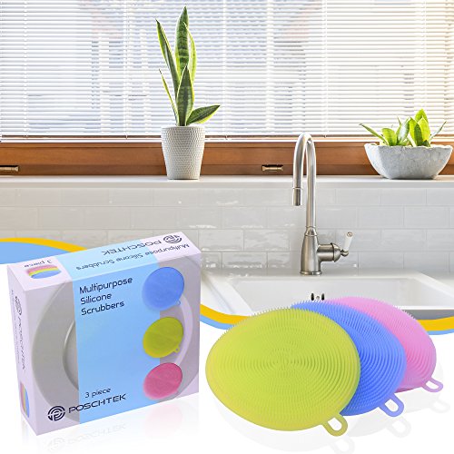 Poschtek Antibacterial Silicone Dish Scrubber Sponge | Mildew Free, Non Stick, Heat Resistant & Flexible Pad | Scrub Pots, Pans & Bowls, Wash Fruit & Veggies, Clean The Sink & Kitchen Countertop 3 PCS