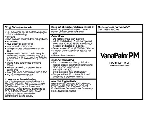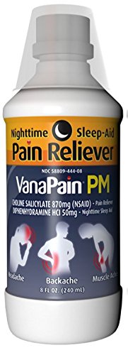 -. Binding : Health and Beauty -. Brand : VanaPain -. Color : Clear -. EAN : 0358809444083 -. Feature : Liquid Pain Reliever + Nighttime Sleep Aid / Non-habit forming sleep aid / For relief of occasional sleeplessness when associated with minor aches and pains / Helps you fall asleep and stay asleep / Also available in a 2oz dose -. Label : GM Pharmaceuticals, Inc -. LegalDisclaimer : Use as directed. Must be 18 years of age & over to purchase -. Manufacturer : GM Pharmaceuticals, Inc -. MPN : 44408 -. PackageQuantity : 1 -. PartNumber : 44408 -. ProductGroup : Health and Beauty -. ProductTypeName : HEALTH_PERSONAL_CARE -. Publisher : GM Pharmaceuticals, Inc -. Size : 8oz -. Studio : GM Pharmaceuticals, Inc -. Title : Vanapain PM Liquid Pain Reliever & Sleep Aid 8oz -. UPC : 358809444083