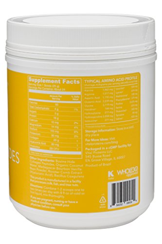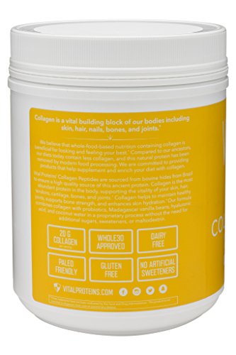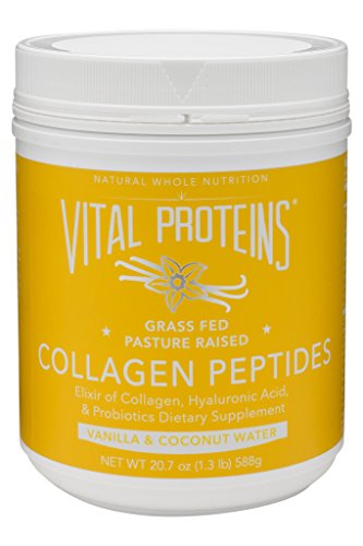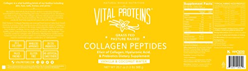 Vital Proteins Collagen Peptides (Vanilla & Coconut Water) are sourced from grass-fed, pasture-raised bovine hides to ensure a natural, high quality, and sustainable source of this nutrient. Collagen is the most abundant protein in the body, supporting the vitality of your skin, hair, tendons, cartilage, bones, and joints. Our peptides are easily digestible and soluble in cold or hot liquids. At Vital Proteins, we believe that whole-food-based nutrition containing collagen is beneficial for looking and feeling your best.Feature