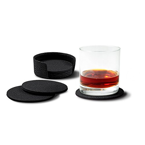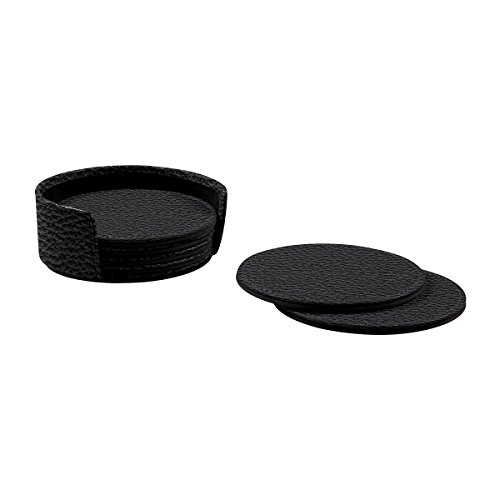 Lucrin - Set of 6 Round Real Leather Coasters with Coaster Holder - Black - Granulated Leather