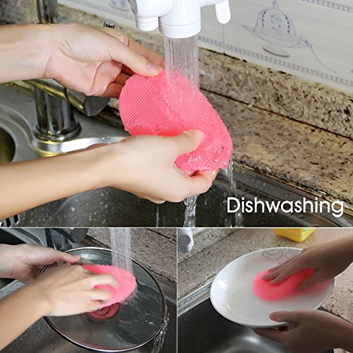 Name: Silicone Dish Sponge. Material: Food grade silicone. Color: Five colors for you to choose. Application: Home, kitchen and other. Package Detail:1 Set (5pcs). SIZE: As picture showes. FEATURES: -- 100% silicone Good-quality .Easy To Clean and Keep DryNon slip, flexible, durable and heat resistant ,Perfect for Kitchen Usage --Double sides: silicone fruit and vegetable is soft and can be used for both sides, great for cleaning fresh mushrooms, apple, potato, or more. --It should be soft enough to clean without scratching or bruising them. also used as coasters or pot holders since they are double --It is the time to say good bye to your lousy and smelly sponge. --Cleaner than your typical sponge - non-porous silicone dries faster and won't harbor bacteria silicone bristles --You can use this to brush pot, plate, pan, bowl can also be used to wash fruit, vegetables. Even you can use it for shower.As the insulation pad more features waiting for you to find. -- Safe to use on non-stick cookware and all other kitchen surfaces. ★NOTE:【MANUFACTURER FULL WARRANTY BY ZBLX】: With The Free Replacement Forever Guarantee, You Never Need To Buy Another Brush. So If It's Not Working, Or Fitting, Or Standing Up To It's Task, You Can Send it Back For A Replacement.