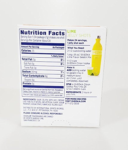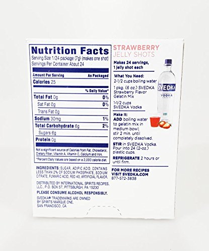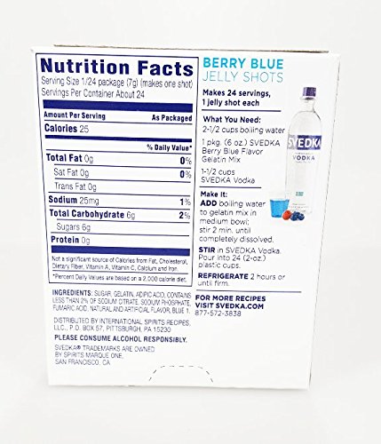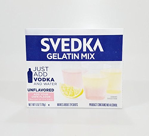 -. Feature : 4 Boxes of Svedka Gelatin Mix / Flavor / Each box makes about 24 Jelly Shots / Just add Vodka and Water