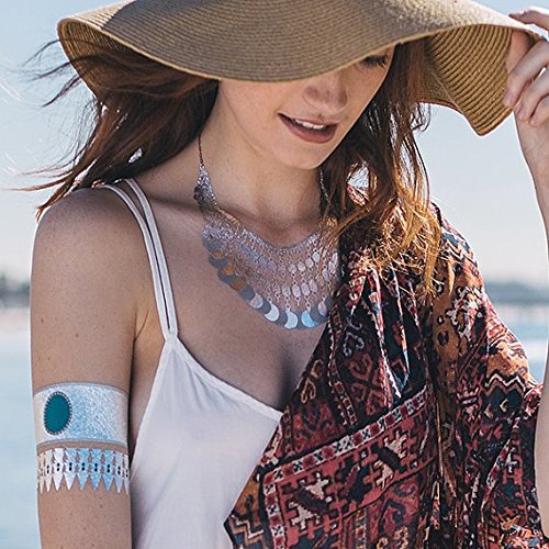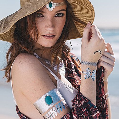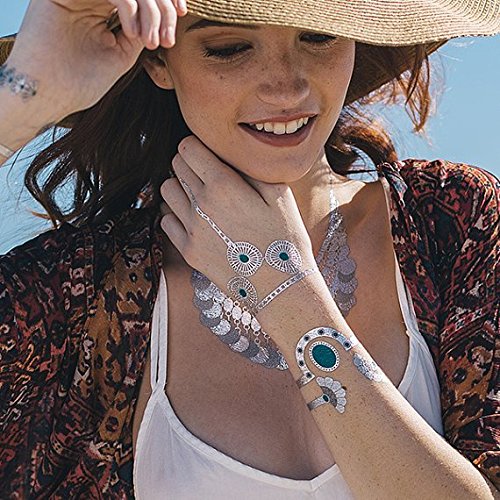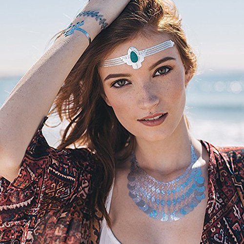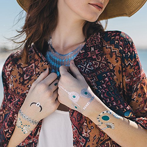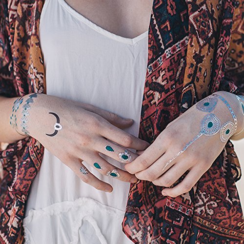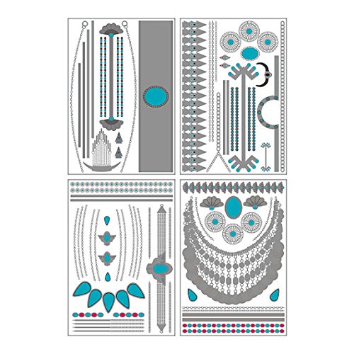 Tattify Metallic Silver Turquoise Jewelry Temporary Tattoos Festival Bound (Set Of 4 Sheets) - Individual Styles Available and Fashionable Temporary Tattoos - Tattoos are long lasting and Waterproof