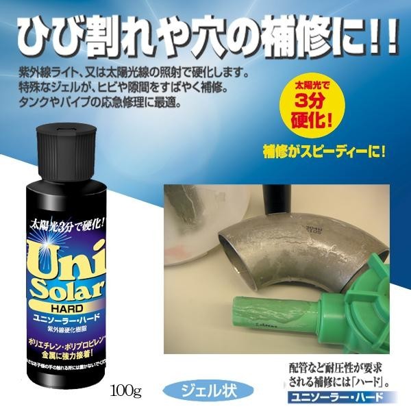 紫外線ライト、又は太陽光線の照射で硬化します。特殊なジェルがヒビや隙間を素早く補修。タンクやパイプの応急修理に最適です。