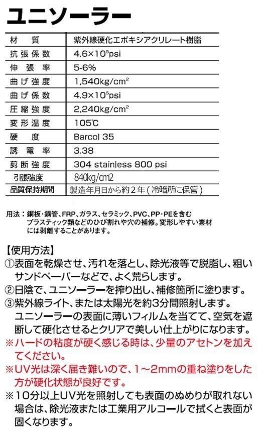 fk094igrjs紫外線ライト、又は太陽光線の照射で硬化します。特殊なジェルがヒビや隙間を素早く補修。タンクやパイプの応急修理に最適です。 製造国:アメリカ 素材・材質:紫外線硬化エポキシアクリレート樹脂 内容量:100g※お届け地域により、別途運賃がかかる場合やお届けできない場合がございますので、お問い合わせ下さい。