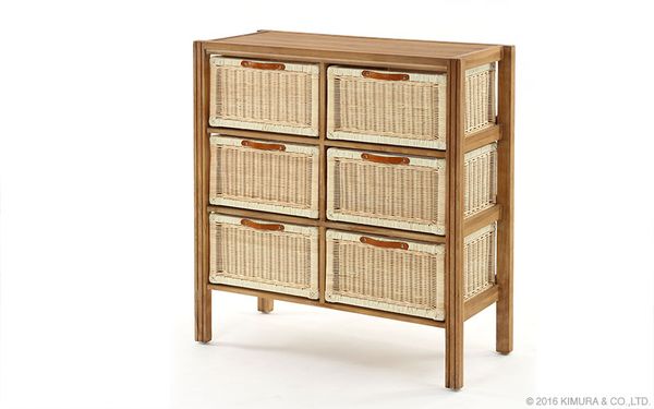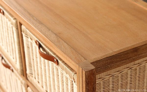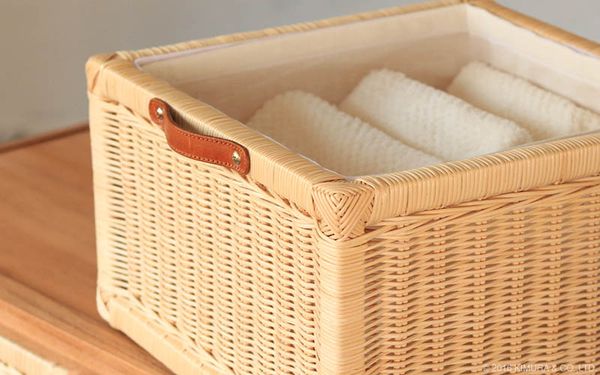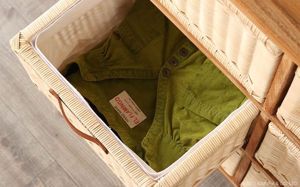 ●引出しは手で編まれた温かみがそのまま伝わってくる、ラタン(籐)製内布付きのバスケット。