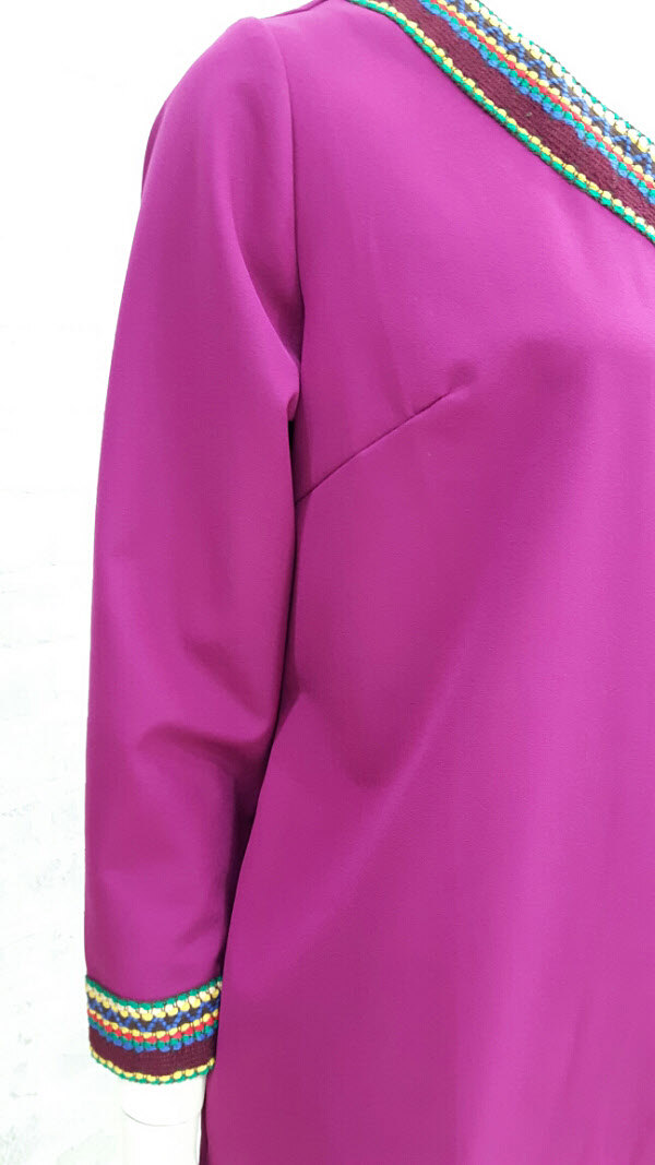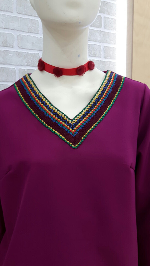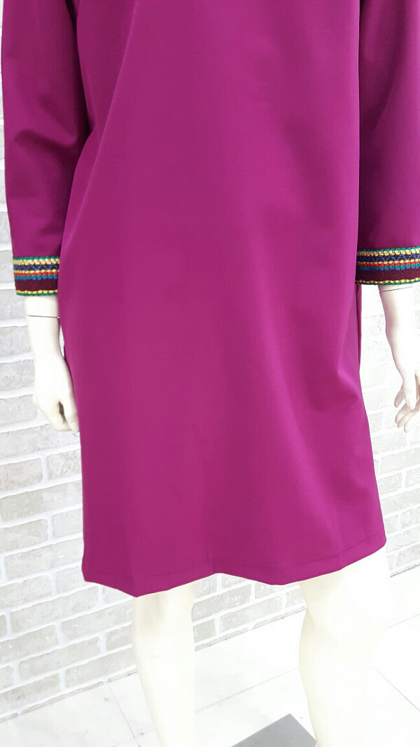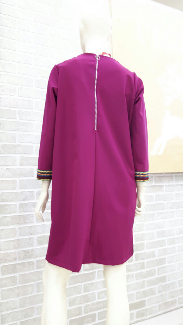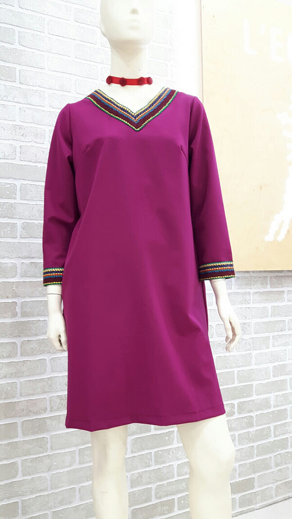 V넥에 기본 인디마원피스 입니다핏은 H라인으로 브이넥부분과 소매부분에 수술자수가있어 세련미가 있는 원피스 입니다