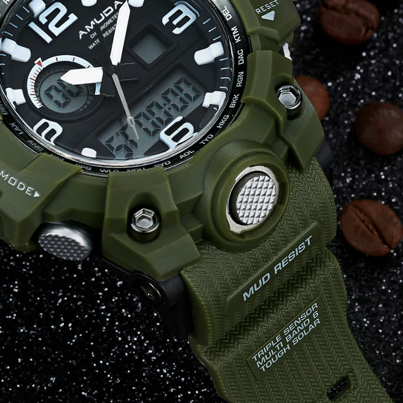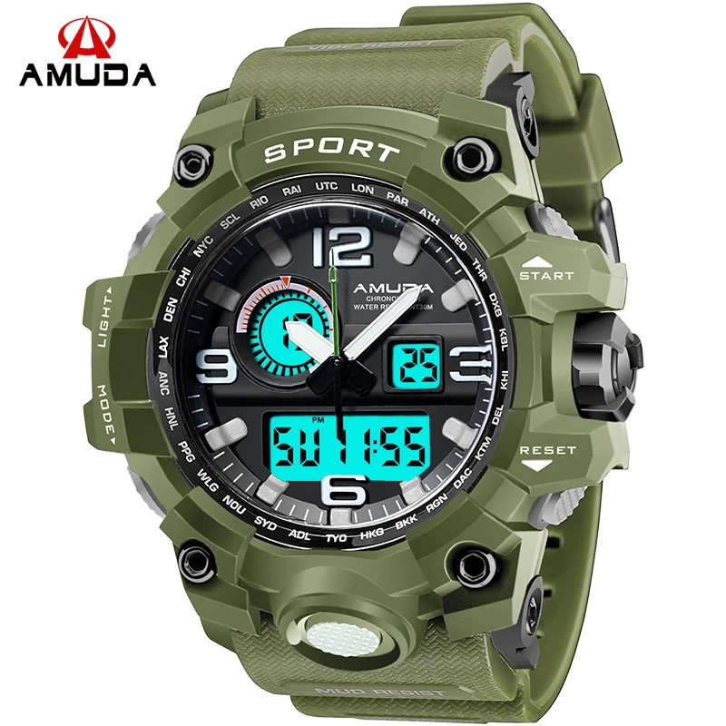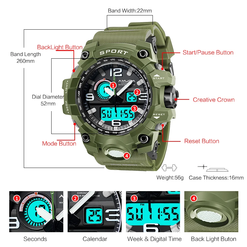 Feature:Complete Calendar,Shock Resistant,Week Display,Water Resistant,Back Light,Chronograph,Multiple Time Zone,LED display,Alarm