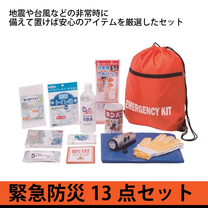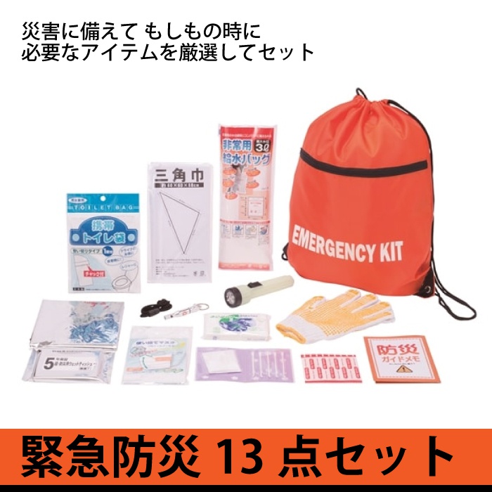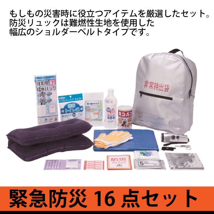 emergency(응급) 백,축광LED라이트,비상용 급수 백(3L용)고, 알루미늄 온열 씨트,수에 흘려 보내는 포켓 티슈(10매)고, 미끄럼방지부 목장갑,휴대 화장실(볼일)고, 방재용 Wet 티슈(20매)고, 비상용 요부코적,삼각건,블루 씨트,보존 수(500ml)고, 건빵(100g)고, 폴리 랩,일회용 마스크,간이 구급 세트(반창고5매면봉5개코튼3매)고, 방재 가이드 메모/각1