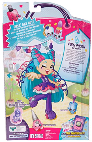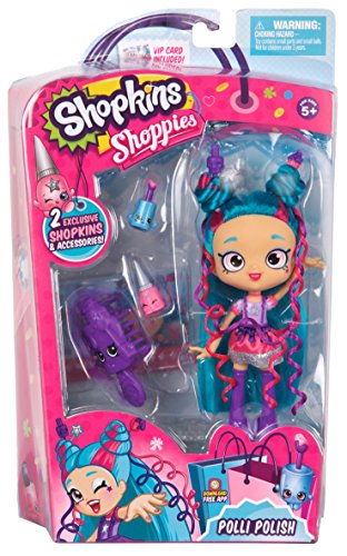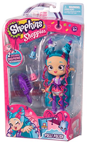 Introducing all new Shoppies, ready to show off their style! Polli Polish always has the hottest colors at her fingertips! Spalshin’ some fashion on her nails is what she does best! But her styles only starts at her fingers, she loves to match it up from head to toe! When it comes the creating the latest look, she nails it every time! Polli Polish comes with a hair brush, 2 Exclusive Shopkins (her BFFs!), a purse, a doll stand, and a VIP card that unlocks bonus content in the Welcome to Shopville AppFeature