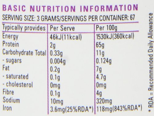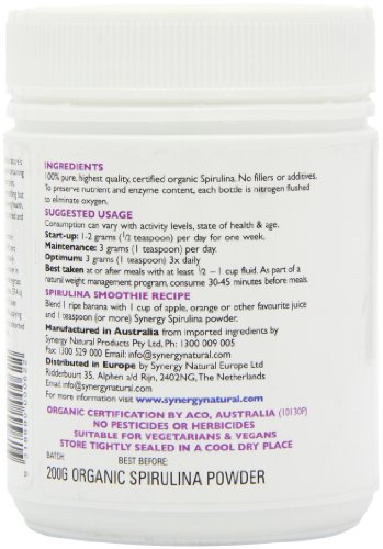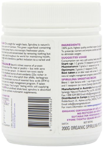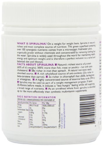 Studio : SYNERGY NATURAL Publisher : SYNERGY NATURAL Binding : Health and Beauty Product Description Nature's richest source of protein, 300 percent more than fish, meat or poultry. 58 x richer in iron than spinach. A natural non toxic easily absorbed source. a rich wholefood source of anti oxidants. 2 x richer in chlorophyll than alfalfa, barley grass or wheatgrass. A highly concentrated source of essential fatty acids (EFA's). Spirulina may be used as part of a weight management program. If taken 30-45mins before meals, it induces a less hungry feeling whilst still supplying a broad range of nutrients. As an unrefined whole food, spirulina is absorbed up to 16x more effectively than synthetic multivitamin supplements. 0