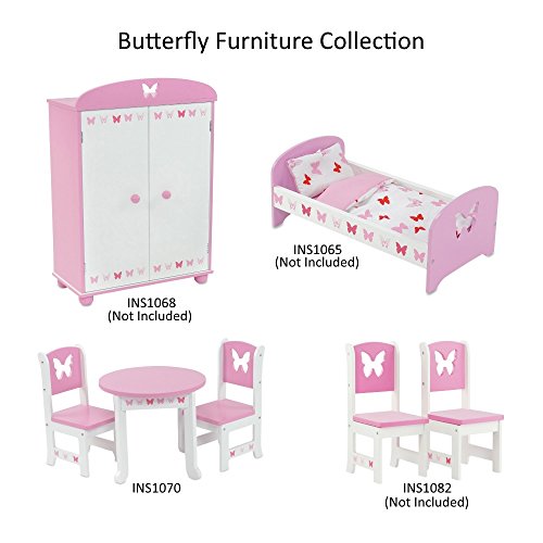 This beautiful dining table and chairs set is part of our Emily Rose Butterfly furniture collection, made exclusively for your 18 inch doll. With boutique style painting on a solid sturdy frame, this furniture is designed to last! Suitable for 18 inch dolls such as American Girl, Gotz, Madame Alexander, etc., this table and chairs set is shipped flat packed and is quick and easy to assemble. Check out other furniture in our Emily Rose Butterfly themed collection by searching product numbers INS1065, INS1066, INS1067, INS1068, or INS1071. Detailed assembly instructions are included. Dimensions provided below are based on the fully assembled product. *Dolls Not Included*Feature