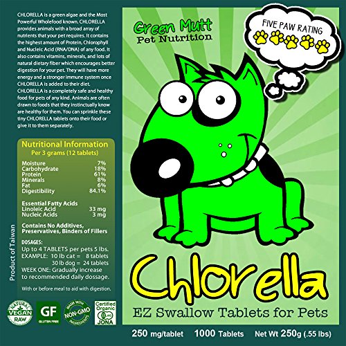 For your dog's nutrition. Don't bark up the wrong tree! Chlorella for dogs is an established "nutritional secret" for a complete healthy pet diet. Best of all, they love the natural taste. Simply sprinkle whole or crushed tablets on dog food or mix with other treats. Green mutt chlorella is the only superfood for dogs that provides concentrated organic nutrition and the superb ability to reduce impurities from your pet's system. Pesticides and other "nasties" challenge our four-footed companions on a daily basis. Canine health problems are exacerbated by both a toxic environment, a more stressful world and the compromised nutritive value of pet foods. Unfortunately today, the majority of our pets also are born with less constitutional vigor than the dogs of yesteryear. Nothing a modern chemist whips up in his lab will ever compare to the organic natural solution nature provides your pet in green mutt chlorella. Because you love your dog, it's important to make sure the chlorella brand you buy for your pet is grown and packaged under very rigorously monitored conditions of purity (premium human grade). If you buy a cheap brand of chlorella for your dog, most likely you are inadvertently adding impurities in his/her body. Let's not do that! You're safe and your dog is happy with the Green Mutt Pet Nutrition brand. As one of our best customers puts it, "bark bark bark bark buy!".Feature