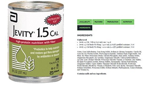 -. Binding : Health and Beauty -. Brand : Abott Nutrition -. Feature : Jevity 1.5 Cal is a calorically dense formula with a patented fiber blend that provides complete, balanced nutrition / 11.8 grams of fat per can / For supplemental or sole-source nutrition -. Label : Abott Nutrition -. Manufacturer : Abott Nutrition -. MPN : 57333 -. PackageQuantity : 1 -. PartNumber : 57333 -. ProductGroup : Health and Beauty -. ProductTypeName : HEALTH_PERSONAL_CARE -. Publisher : Abott Nutrition -. Studio : Abott Nutrition -. Title : Jevity 1.5 High Protein Nutrition Drink with FOS 8oz Cans 24/Case *4 CASE SPECIAL*