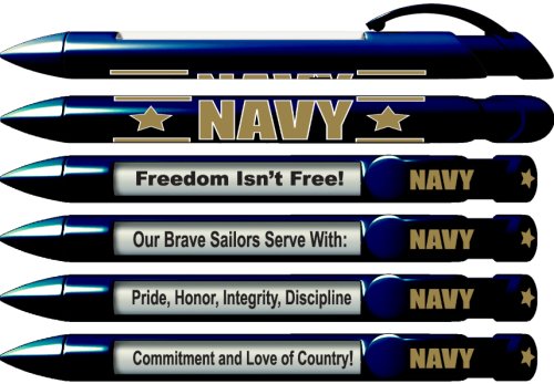 -. Feature : Set includes 6 pens; each pen is a "Navy" Military Service pen with 4 messages of support that rotate with every click of the pen: / Message 1: Freedom Isn't Free! / Message 2: Our Brave Sailors Serve With: / Message 3: Pride, Honor, Integrity, Discipline / Message 4: Commitment and Love of Country