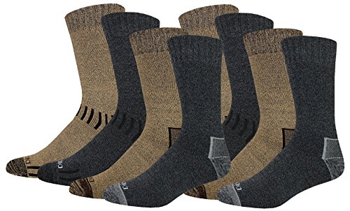 -. Binding : Apparel -. Brand : Dickies -. Department : mens -. Feature : Moisture Control Fibers: Soft cotton blended with moisture wicking fibers keep feet dry and comfortable / Full Cushion Throughout Foot and Leg: Full cushion throughout foot and leg provides added comfort. / Stay-Up Power Welt: Keeps socks in place to maximize comfort. / Reinforced and Reciprocated Heel and Toe: Provides added durability and superior fit. -. ProductGroup : Apparel -. ProductTypeName : SOCKSHOSIERY -. Title : Dickies Men's All Season Marled Moisture Control Crew Socks, 8 Pair