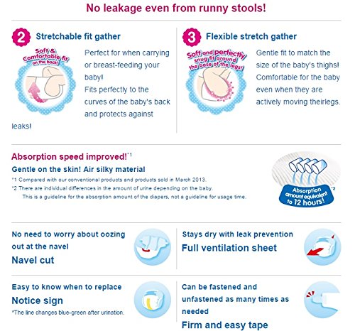 1*81 pcs.Japanese diapers Moony S - (4-8 kg)Your baby grows, becoming more and more active. It means there is time to change the design of the diapers, opting for the dry skin no matter what the baby is doing: playing, moving or breastfeeding. The Japanese diapers Moony S for babies from 4 to 8 kilos are absorbing more liquid and are designed especially not to hamper the movements.The soft and smooth diapers are air conditioned, and the secure band is easily stretched for 2-3 cm, not hampering the baby's breath. The diapers have three layers - air conditioned, protecting from bacteria and absorbing layer. The elastic bands in front and at the back protect from leaks, keeping the baby comfortable. The diapers have the filling indicator, and they are easy to use.Opting for functional and highly quality diapers Moony S, you will provide maximum care for your baby.