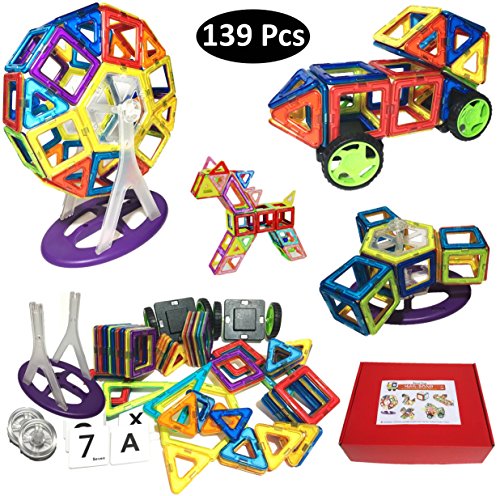 -. Feature : GREAT VALUE PACK OFFERS MORE PIECES IN LESS MONEY: Totally 139 pieces: including 46 Triangle, 30 Square, 2 Hexagon, 2 Rhombus, 4 long Triangle, 2 pairs of car wheels (6 pcs), 1 Ferris set (8 pcs), 26 plastic Letters, 15 plastic Numbers and 1 instruction book. You will get MORE MAGNETIC BLOCKS (84 Pcs) AS COMPARED TO OTHER BRANDS for your money. Random rainbow color and compatible with other brands. / HIGH QUALITY, SAFE AND STRONG MAGNETIC BLOCKS: Made of non-toxic, food grade premium quality ABS plastic and super natural mineral stone magnet to meet American/International ASTM, HR4040 & EN71 safety standards. Anti-scratch smooth edges of magnetic blocks provide extra safety and easy to clean task. / AIDS IN BRAIN DEVELOPMENT: Children are passionate about exploring the surrounding environment. It stimulates their curiosity and inspires imagination and an interest in science and engineering which ultimately enhance their creativity, mathematical thinking and fine motor skills. / UNLIMITED FUN & IMAGINATION: Countless possibilities for beginners, juniors, advanced and professional modeling. To create some complex formulations, you may need pieces more than provided in this set. It helps children to learn colors and shapes while playing and develop the creativity and imagination beyond expectation. / BUY WITH CONFIDENCE: We ensure 100 % money back guarantee if you are not satisfied with our product. Please feel free to contact us; we will give you a full refund or a new replacement.