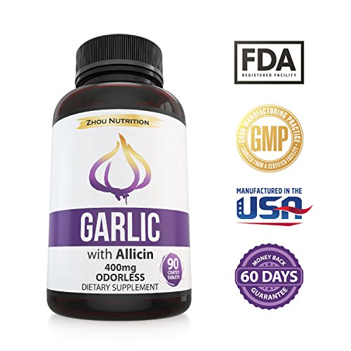 -. Feature : THE ALLICIN DIFFERENCE- Allicin is the critical health component in garlic (beneficial to the immune system and circulatory system) that is released from a freshly crushed clove. Our manufacturing process captures the Allicin so it is not lost in processing. Most supplements on the market do not contain allicin (or do not protect it from stomach acid with an enteric coating), but Zhou Nutrition's Garlic supplement contains at least 5000mcg of allicin in every tablet. / MORE CONVENIENT THAN A CLOVE- For some of us, eating garlic daily is not ideal. With our Odorless Garlic With Allicin, you'll get the amazing health benefits of garlic's Allicin without the hassle, taste, and odor of eating a clove. The enteric coating on the capsules protects the garlic from being broken down in the stomach before entering the small intestine, where it is most effective. / HEART-HEALTHY BENEFITS- The benefits of garlic have been widely known for centuries, and modern technology has now made it possible to harness the most useful components to give us maximum health potential. Today with Zhou Nutrition's Garlic with Allicin Supplement, you can begin to promote healthy blood pressure levels and overall heart health. / IMMUNITY-BOOSTING ANTIOXIDANT- Support your immune system! Garlic contains antioxidants that protect against cell damage and may boost immune cell function, which is especially important during seasons when our immune systems are most vulnerable. Additionally, oxidative damage from free radicals contributes to the aging process, and garlic protects against this as well. / OUR 100% MONEY-BACK GUARANTEE - As with all of our products, we offer a 60-DAY 100% Money Back Guarantee - return even the empty bottles! We are so confident that you will love our Garlic with Allicin that we'll refund every penny if you don't like it. Simply contact Zhou Nutrition directly for a full refund. What do you have to lose?