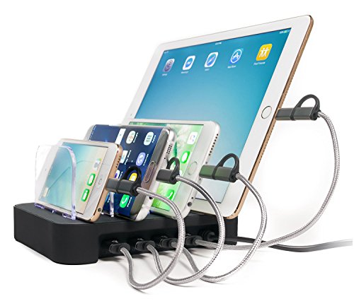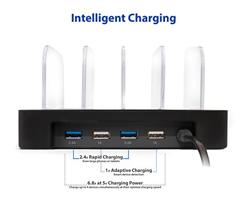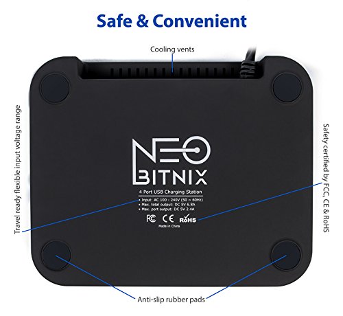 NeoBitnix 4 USB Port Charging Station 34W 6.8A with Charger Cables - Universal Organizer Dock for Multiple Mobile Devices, Tablets, Cell Phones, iPhone 4, 5, 6, 7, iPad, iPod, Samsung, HTC, LG (Black)