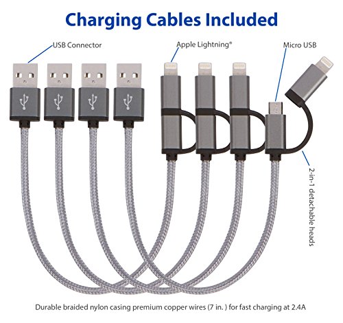 CABLES INCLUDED — 4 Apple Lightning / Micro USB 2-in-1 connector durable braided nylon 7 inch charging cords