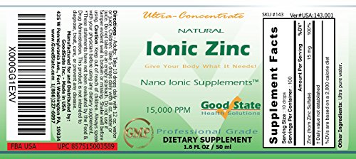 -. Binding : Health and Beauty -. Brand : Good State -. Color : Regular -. EAN : 0857515003589 -. Feature : Now also available in GLASS BOTTLE! (search "Good State Ionic Zinc Glass Bottle") / Absorbs Much Better Than Pills! / Only 10 drops equals 15 mg of Ionic Zinc - 100 total servings / Small size - very convenient for travel - Comes with dropper! / Easy to mix with juice or water. Can be taken sublingually. -. IsAdultProduct : 0 -. Label : Good State -. Manufacturer : Good State -. Model : 143 -. MPN : 143 -. NumberOfItems : 1 -. PackageQuantity : 1 -. PartNumber : 143 -. ProductGroup : Health and Beauty -. ProductTypeName : HEALTH_PERSONAL_CARE -. PublicationDate : 2014-10-02 -. Publisher : Good State -. Size : 1.60 oz. -. Studio : Good State -. Title : Good State Liquid Ionic Zinc Ultra Concentrate (10 drops equal 15 mg - 100 servings per bottle) -. UPC : 857515003589