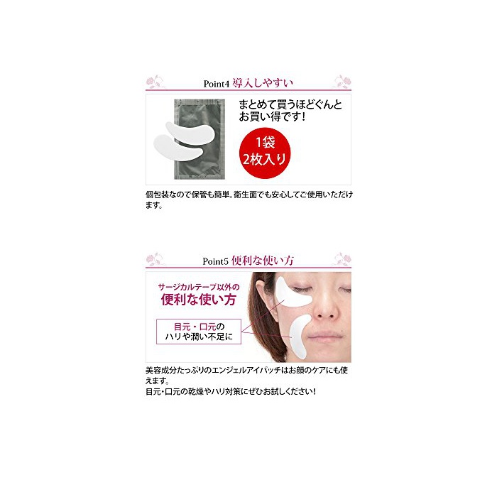 【상품 설명】시술을 받는 것이면서(눈매)눈가케어로 입는다,미용액이 충분히 얼룩 붐볐 IC《도마스쿠》입니다.시술 스텝은 그대로,여느 써지 진료기록카드《―푸》를 엔젤 아이 패치에 바꾸는 것 뿐(만,만큼)!하속눈썹을 친절하게 보호 하면서(눈매)눈가의 트리트먼트 를 할 수 있습니다.(눈매)눈가로 피트 하기 쉬운 R 컷이 예쁘게 장착하기 쉽고, 점착력도 약하기 때문에 피부(기)나 속눈썹을 손상하는 일 없이 벗길 수 있습니다.1회분(2 매세트)가 알루미늄 팩에 들어 가 있으므로,건조를 막아 위생적입니다.