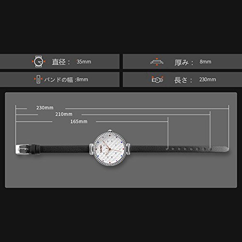 -. Feature : ケース直径:35mm ケース厚み:8mm バンド調節:165~230mm、重量:約32g / バンドは本革、耐久性/耐磨耗性に優れています。防水機能は30m程度 です。水に濡れるも大丈夫です / おしゃれな外観:ファッション好きな女性向けの腕時計、しかもキラキラしているダイヤモンドつき、非常にかわいくて綺麗です。 時刻を確認すると同時に、ファッションとしての役割も果たす。高級感があるため、仕事、日常生活も気楽で使えます。 / 文字盤の中にピカピカしている宝石で装飾されています。非常に綺麗で、落ち着いた女性らしさを演出します。 シンプルな服装でもオシャレに見せることができます。 日常のアクセサリーとしていいです。友だち、恋人、家族へのプレゼントにおすすめ。 / ※30日以内返品/返金/交換サービスを提供いたします。※ご購入日から30日以内返品?交換?返金が可能です。ぜひお気軽にお問い合わせ下さい。