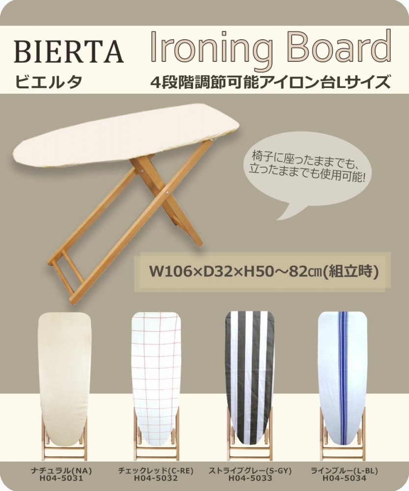 | 素材・材質 | 本体:スチールメッシュ(粉体塗装) 脚部:ビーチウッド(ブナ材) アイロン置台:スチール(クロームメッキ) クッション材:ポリエステル カバー:綿100% |