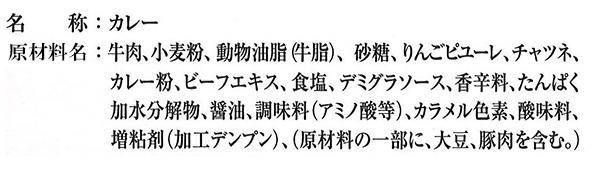 | 原材料 | 名称:カレー 牛肉、小麦粉、動物油脂(牛脂)、砂糖、りんごピューレ、チャツネ、カレー粉、ビーフエキス、食塩、デミグラソース、香辛料、たんぱく加水分解物、醤油、調味料(アミノ酸等)、カラメル色素、酸味料、増粘剤(加工デンプン)、(原材料の一部に、大豆、豚肉を含む) |
