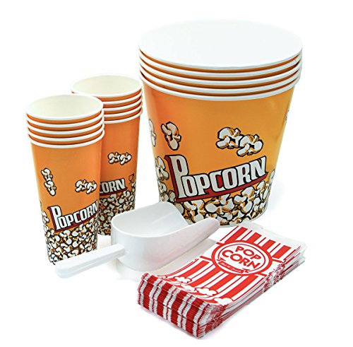 Set of 50+ Popcorn containers - 5 Buckets (170oz) - 10 Cups (24oz) - 35 Paper Bags (1oz) plus White Plastic Scoop