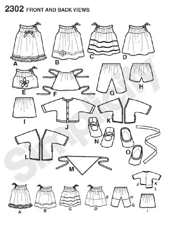 -. Feature : Doll clothes in size os (one size), simplicity pattern 2302 / Number of looks included:15 / Designed and manufactured in the U.S.A / Sested Fabrics: Cotton and Cotton Blends, Flannel, Broadcloth, Calico, Gingham, Pique, Seersucker