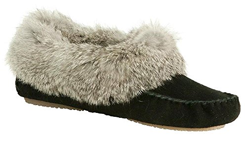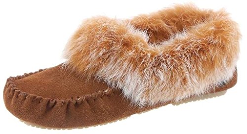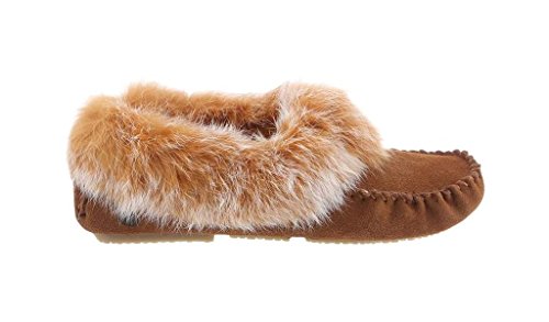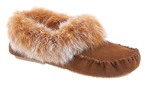 -. Feature : Step into exotic luxurious comfort in the Kacey Moccasin slippers by Bearpaw / These adorable slippers features soft sustainable rabbit fur collar with genuine sheepskin footbed / Round toe moc stitch design in genuine suede leather upper / Split rubber traction outsole for indoor/outdoor wear