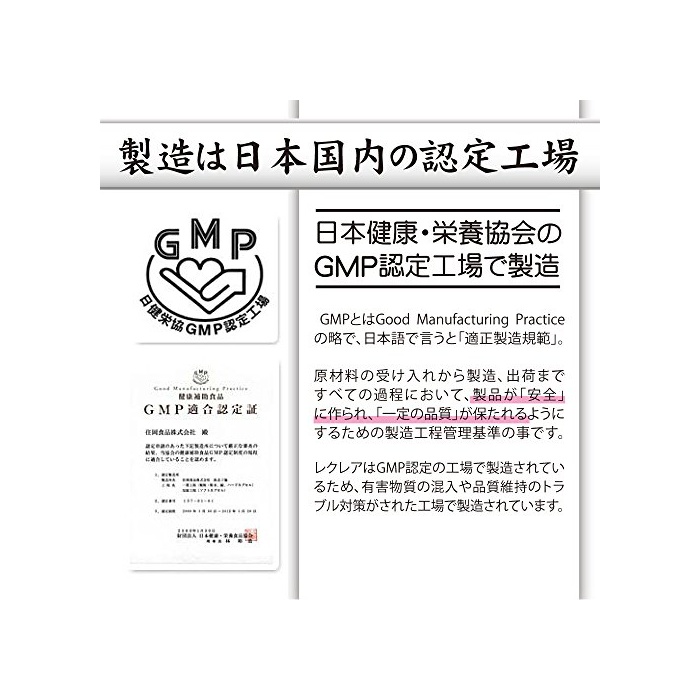 제조 공장은 일본 국내.일본 건강 영양 협회의 GMP인정 공장으로 제조.GMP란 Good Manufacturing Practice의 생략에,일본어로 말하면「적정 제조 규범」.원재료의 수락부터 제조,출하까지 모든 과정에 있어서,제품이「안전」에 만들어지고,「일정 품질」가 유지되도록 하기 위한 제조 공정 관리 기준 입니다.유해 물질의 혼입이나 품질 유지 트러블 대책이 된 공장으로 제조되어 있습니다.